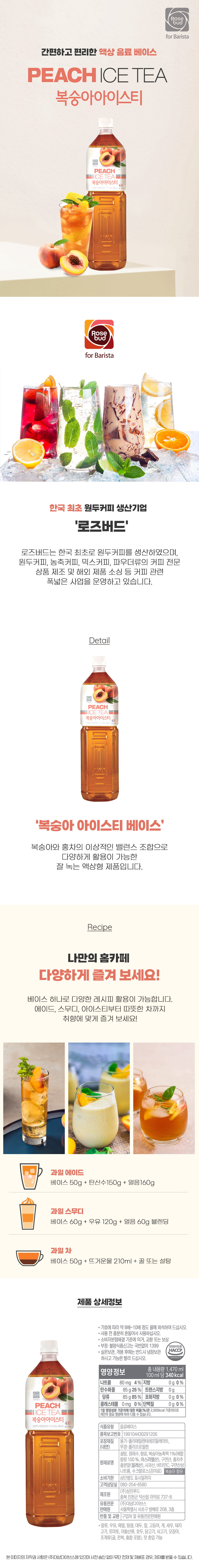 | 주원료명 | 복숭아농축액1%(이스라엘산,68brix기준),홍차분말(고형분95%이상,칠레산),백설탕,정제수,합성착향료(복숭아향),구연산,사과산,비타민C,구연산삼나트륨,수크랄로스 |